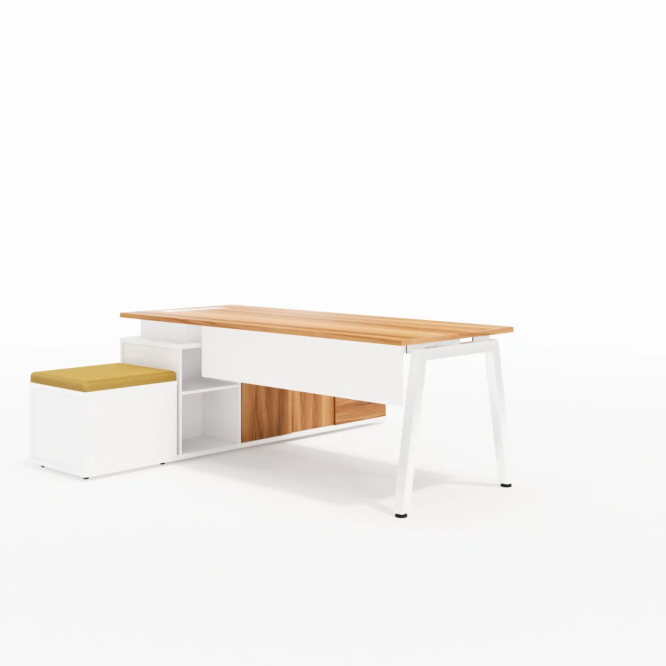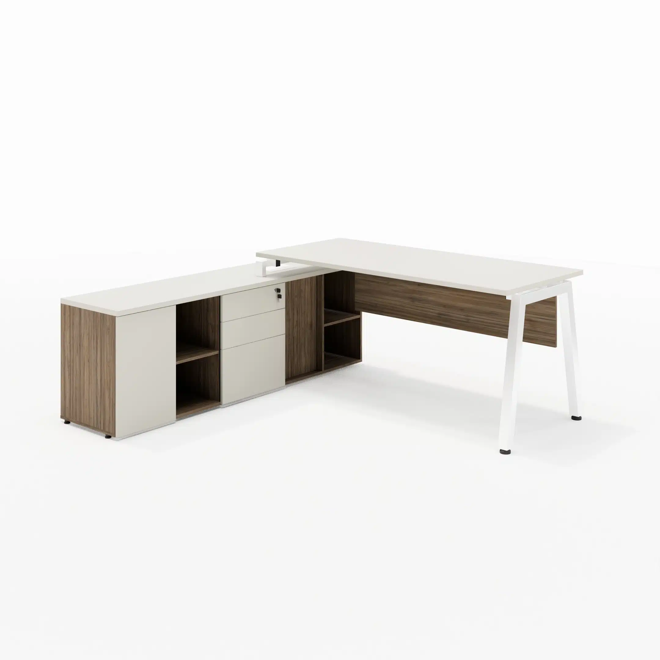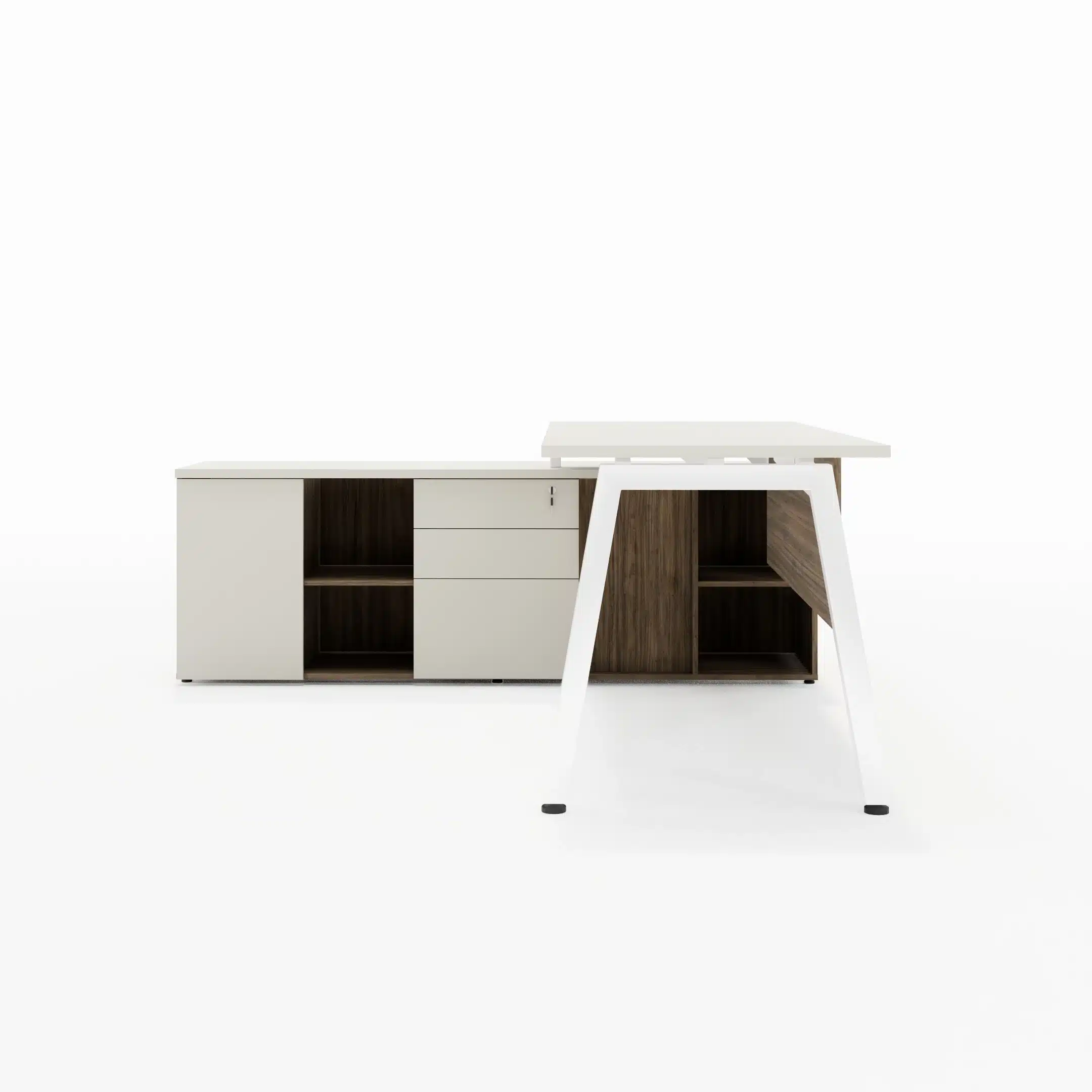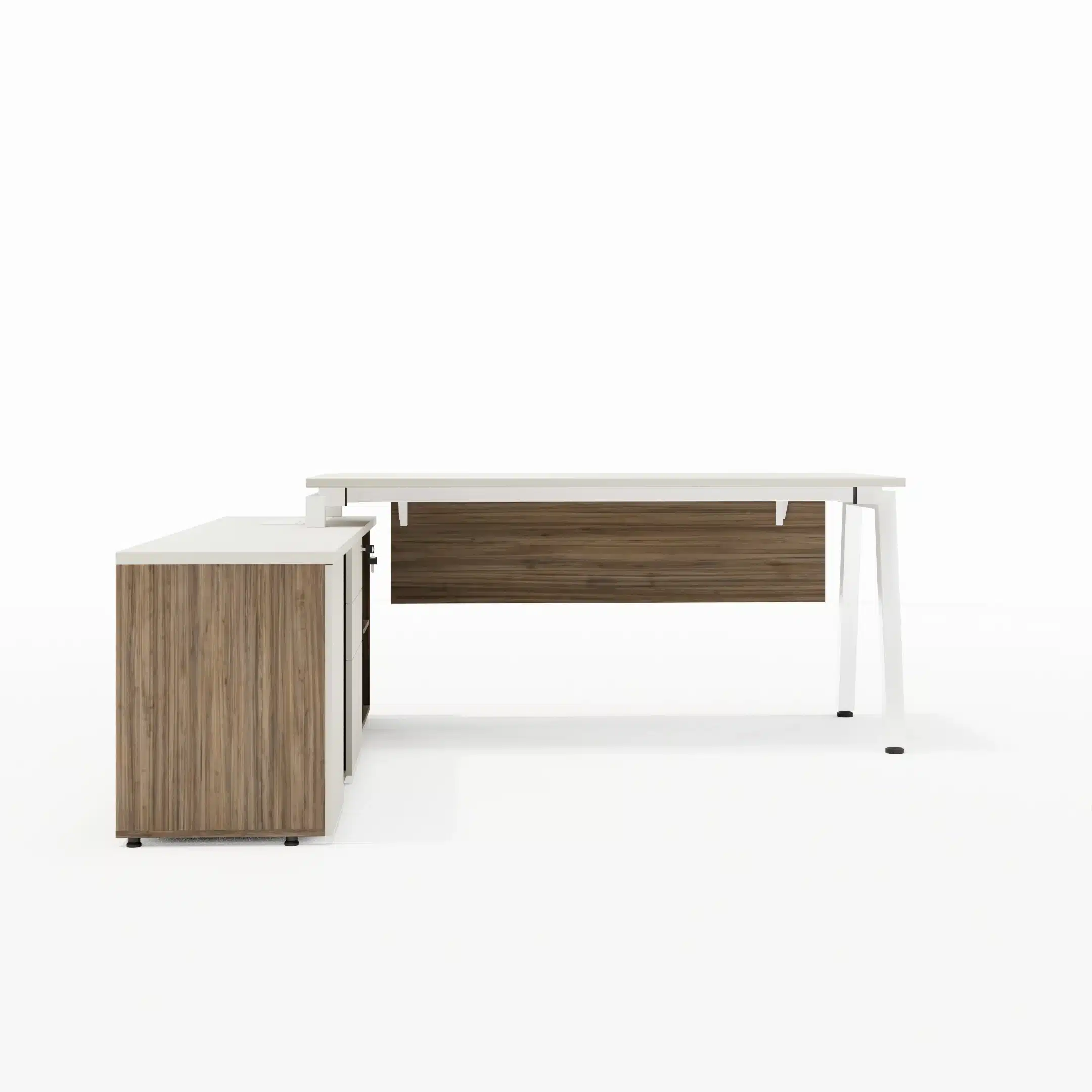 Mesa com Tampos em MDP 25mm com borda de 2mm, pés cavalete metálicos com 50x50mm, painel frontal em MDP 15mm e sistema de fixação através de parafusos com rosca milimétrica e buchas metálicas