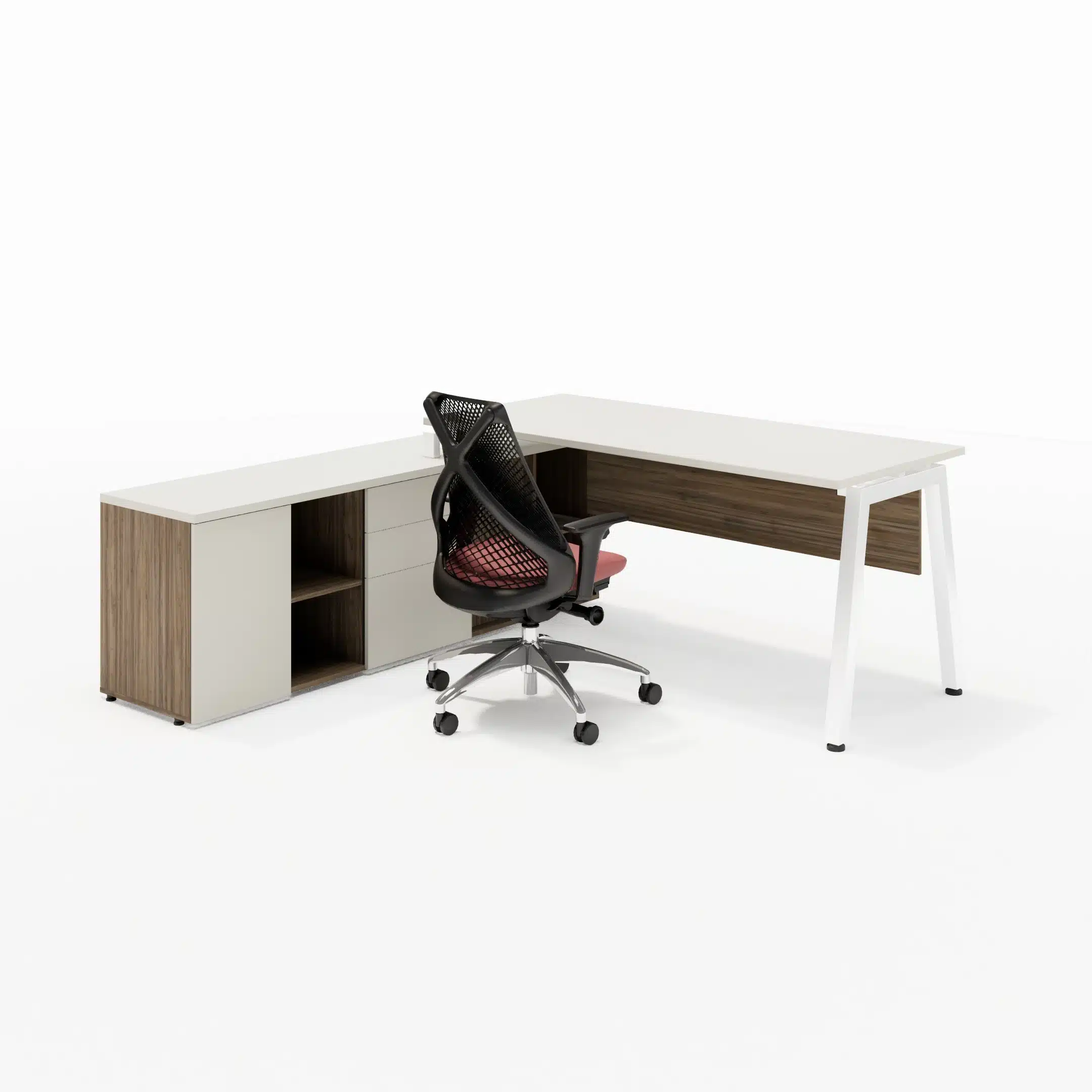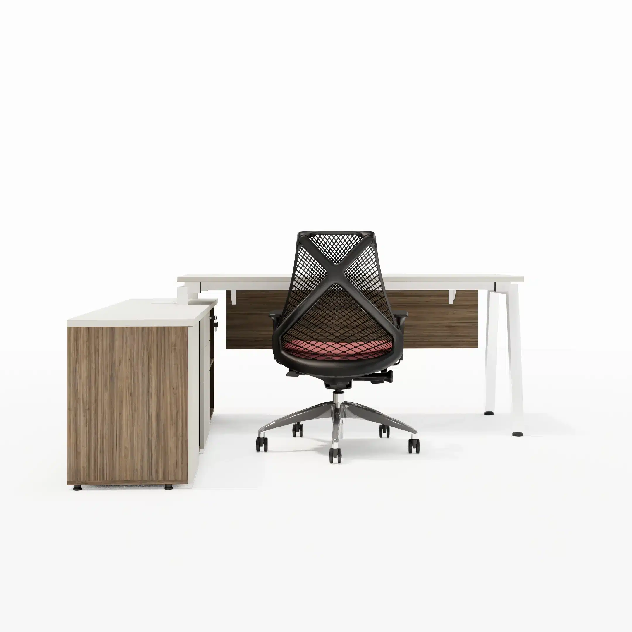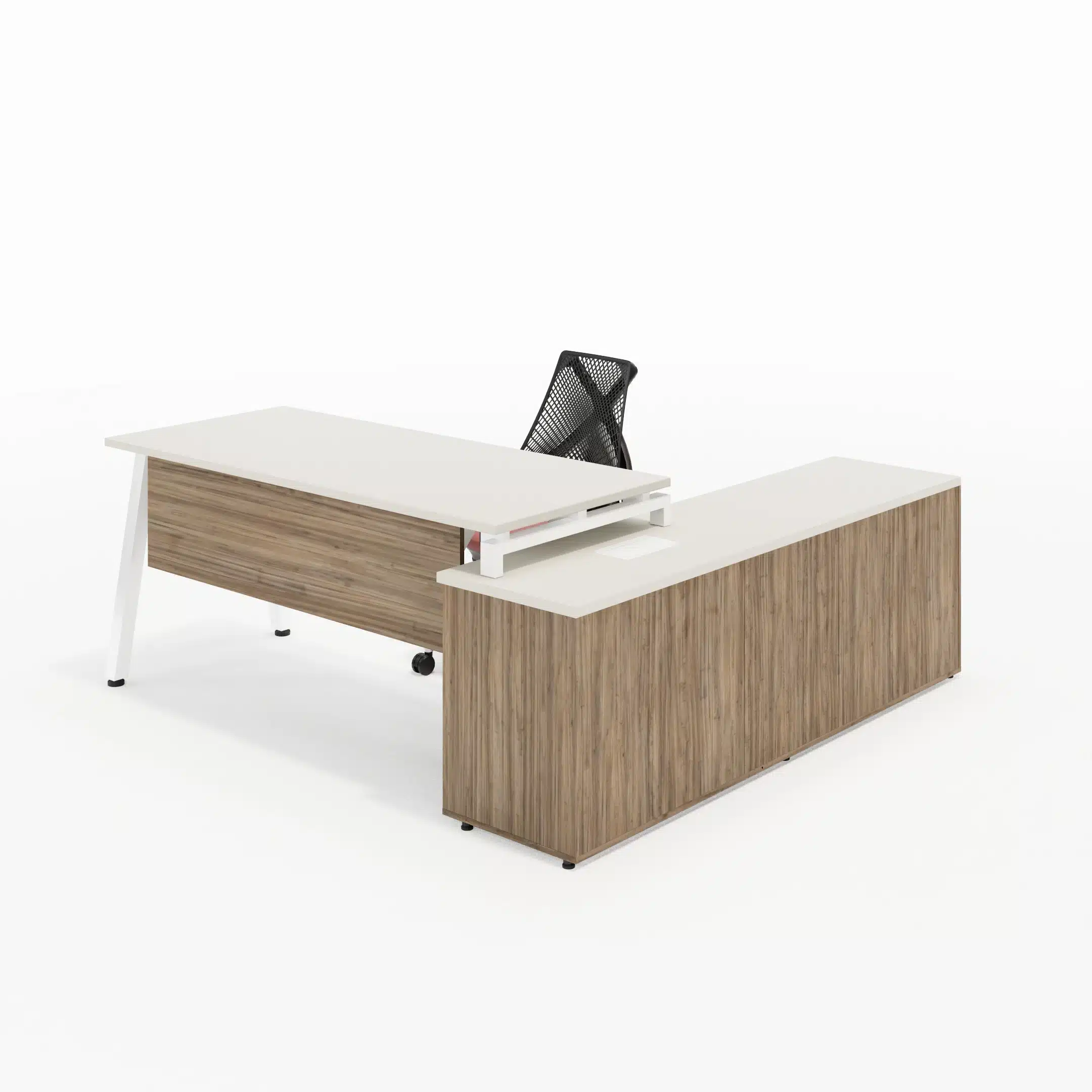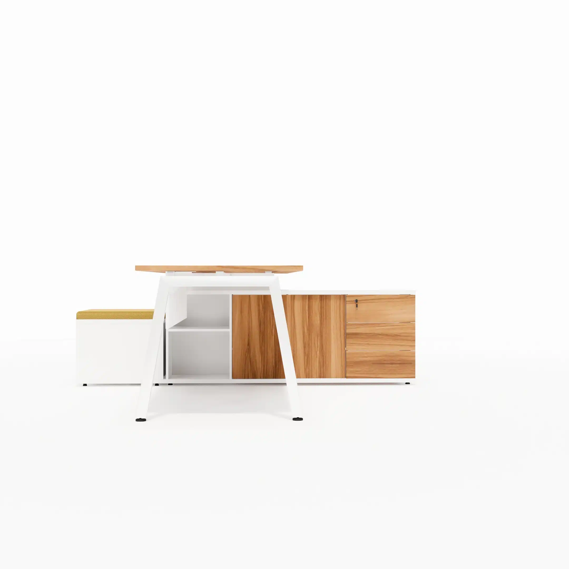 Mesa com Tampos em MDP 25mm com borda de 2mm, pés cavalete metálicos com 50x50mm, painel frontal em MDP 15mm e sistema de fixação através de parafusos com rosca milimétrica e buchas metálicas